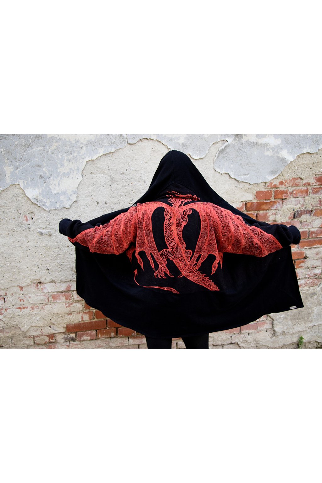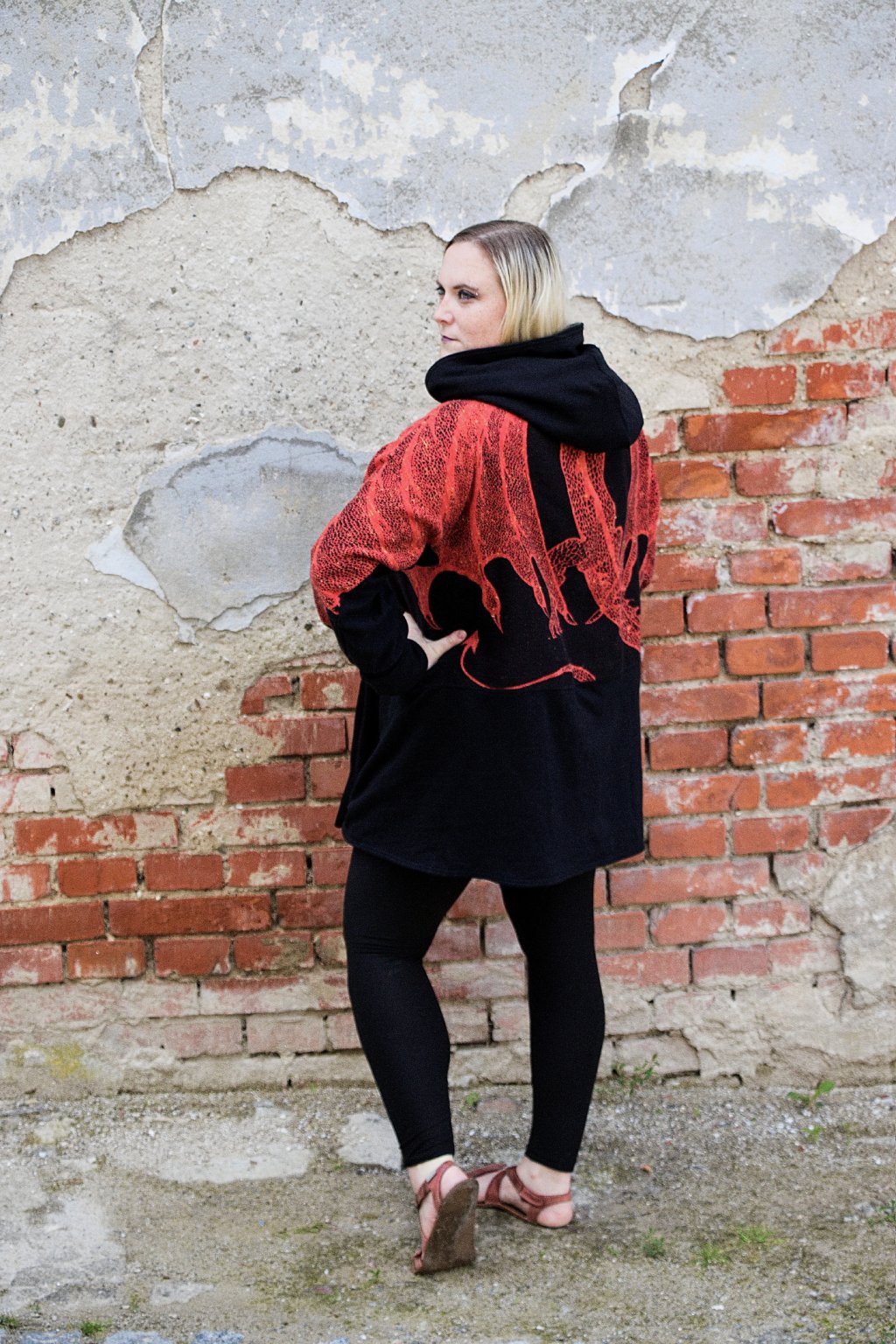 Cardigan nezvyklého volného střihu, který ti přidá na tajemnosti, s motivem draka na zádech a části kapuce.