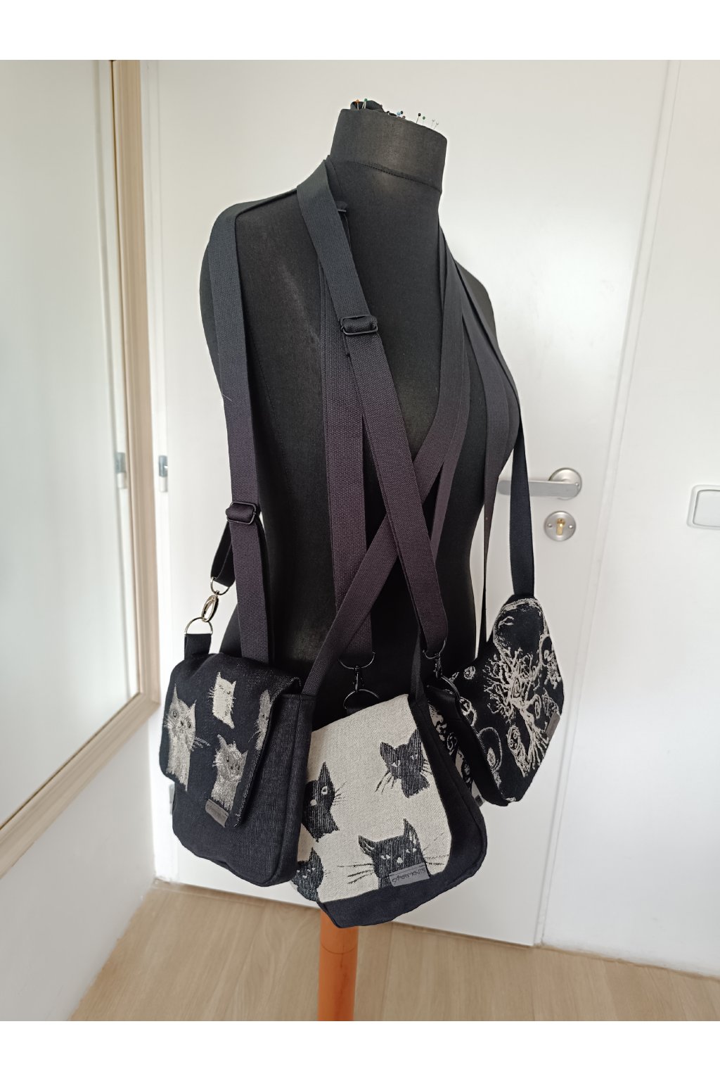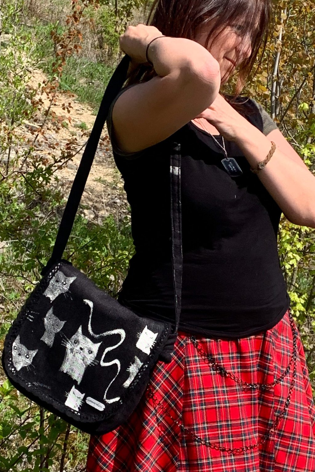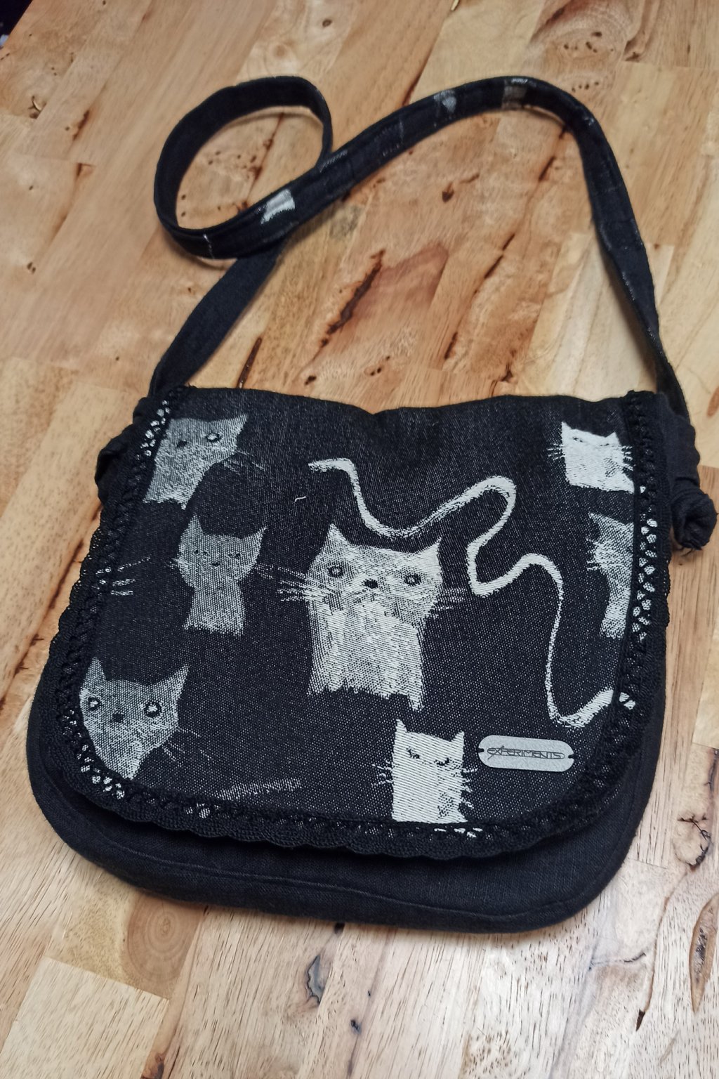 Kabelka z pevného lnu a scrapu nosicího šátku Wild Slings s motivem koček.