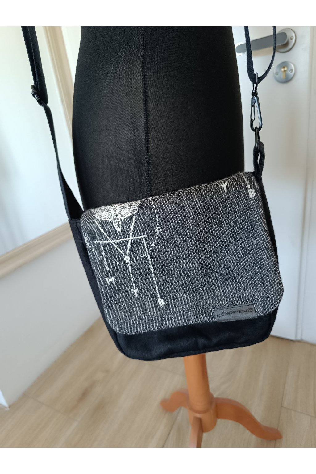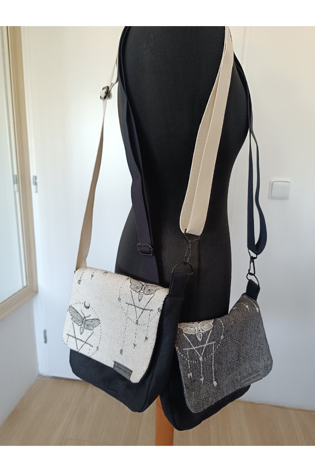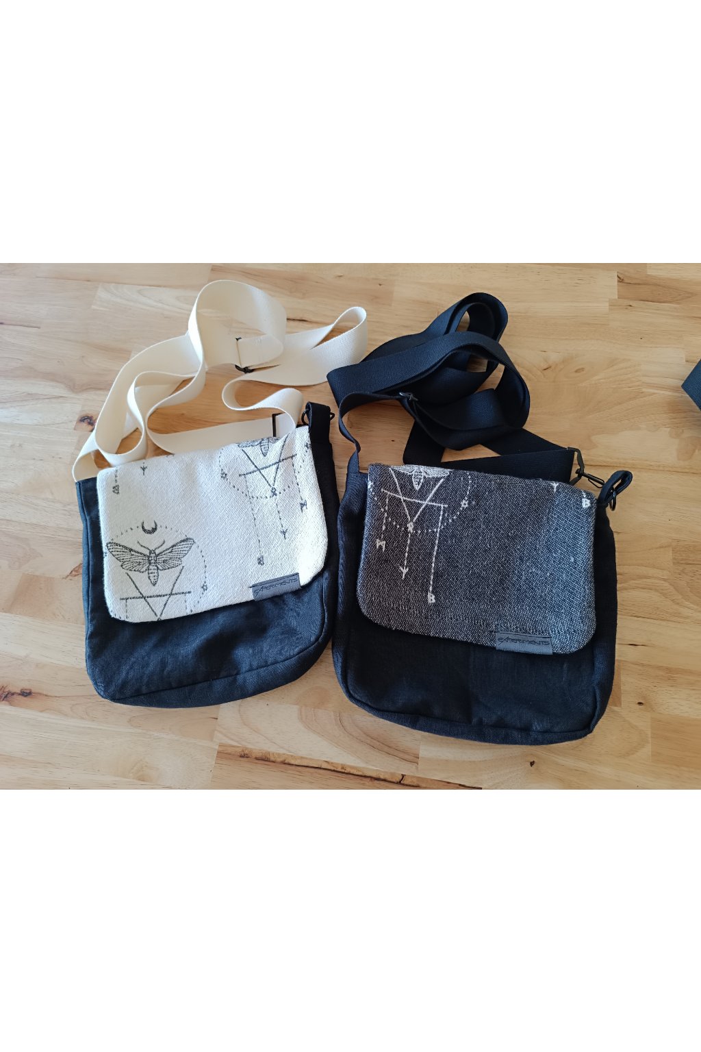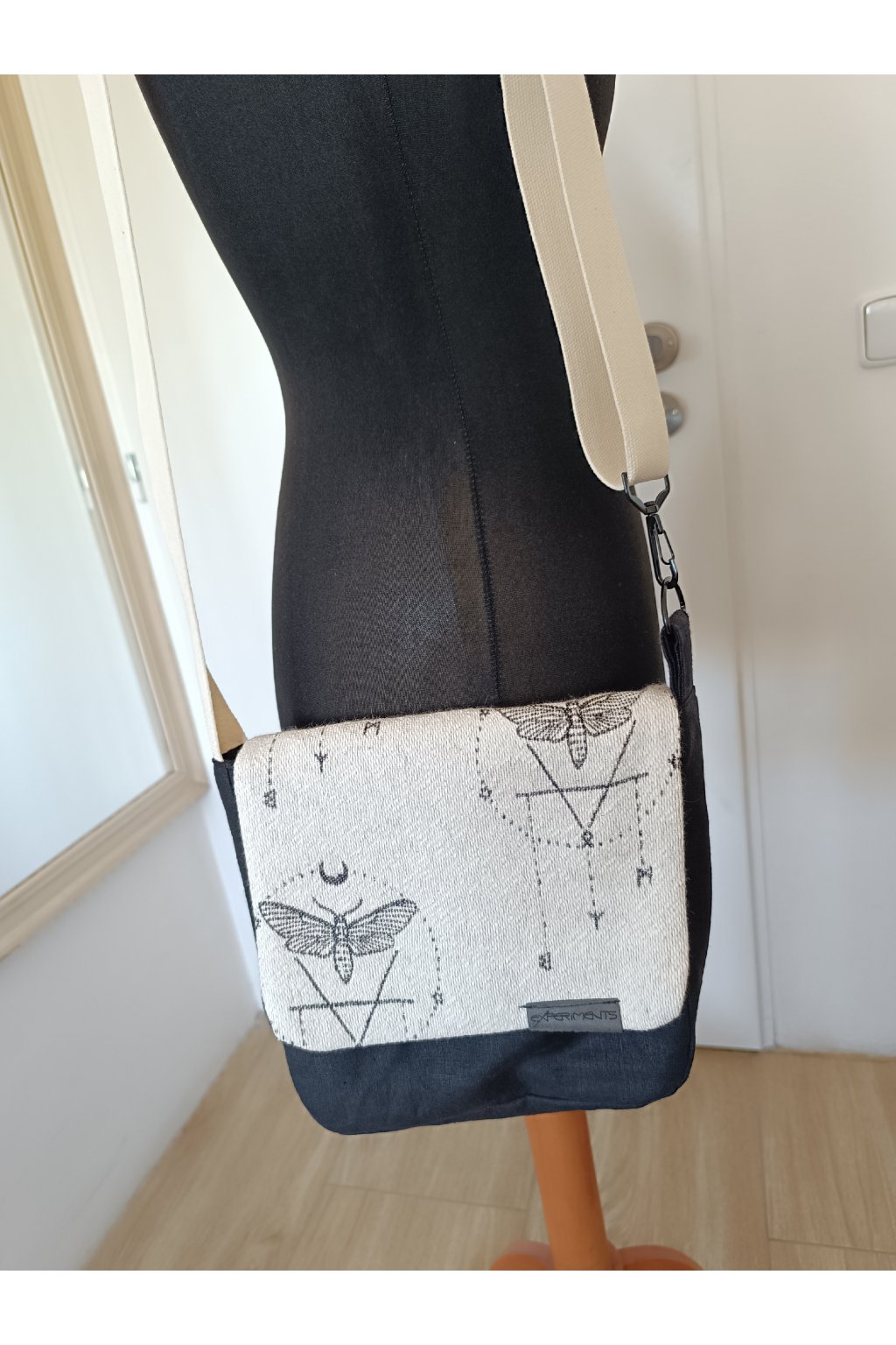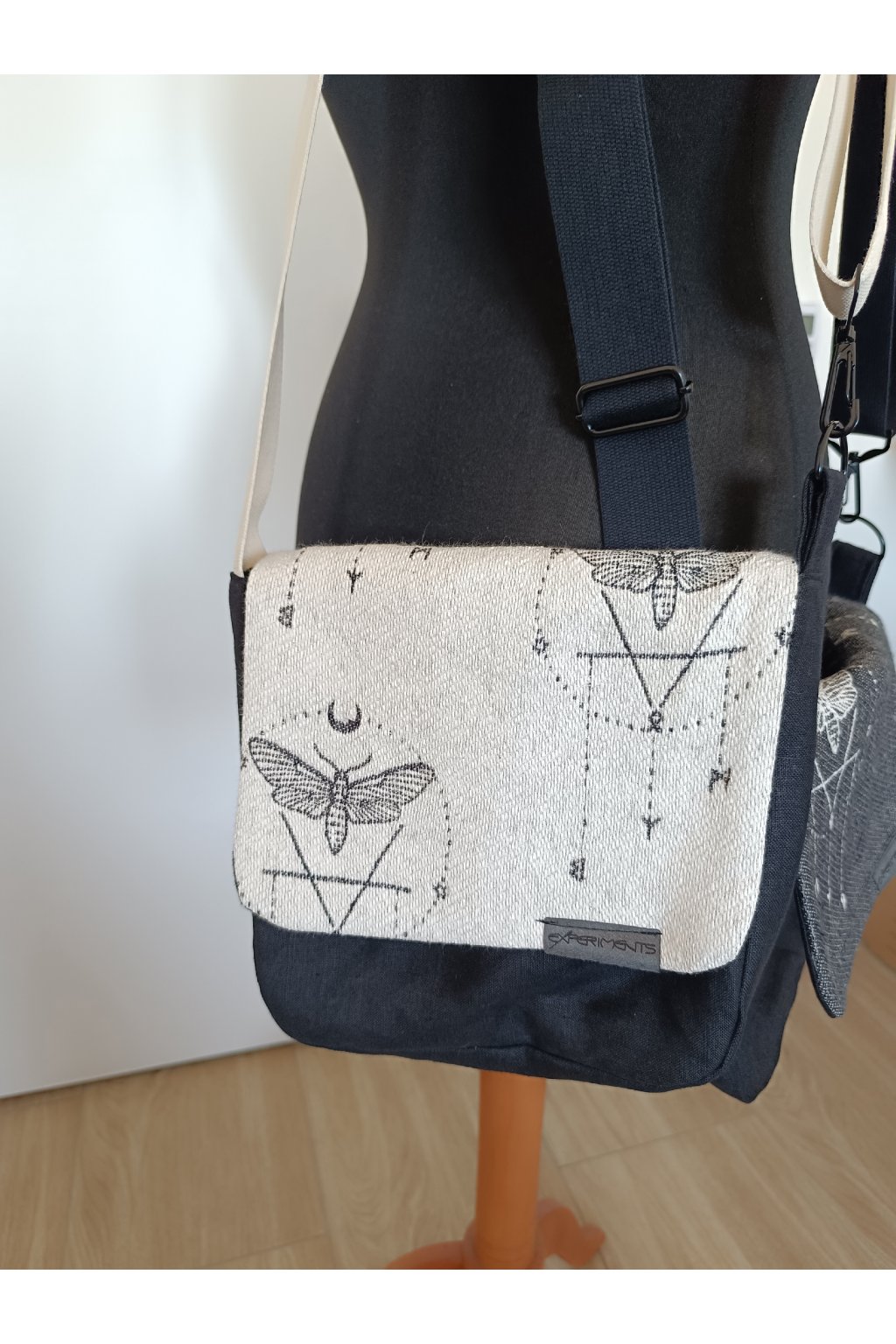 Kabelka z pevného lnu a scrapu nosicího šátku Wild Slings s motivem můry.